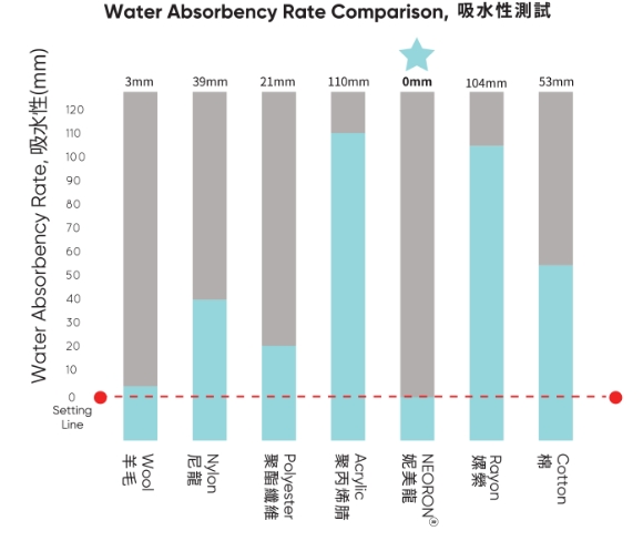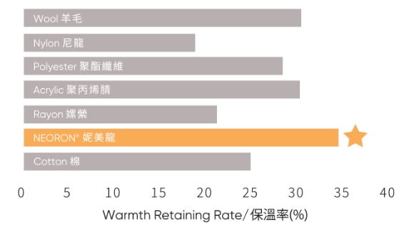 妮美龍纖維不吸水也不吸汗,且易乾,讓人覺得乾爽、舒適和溫暖。